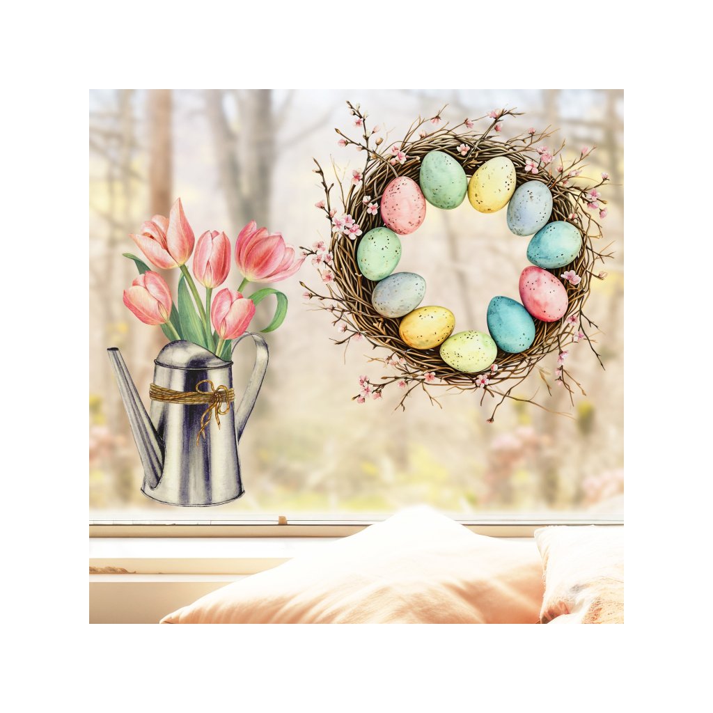 Sada velikonočního věnce a tulipánů vás hned naladí na sváteční jarní náladu. Ozdobte si svá okna s touto krásnou a efektivní samolepkou a přivítejte Velikonoce stylově.