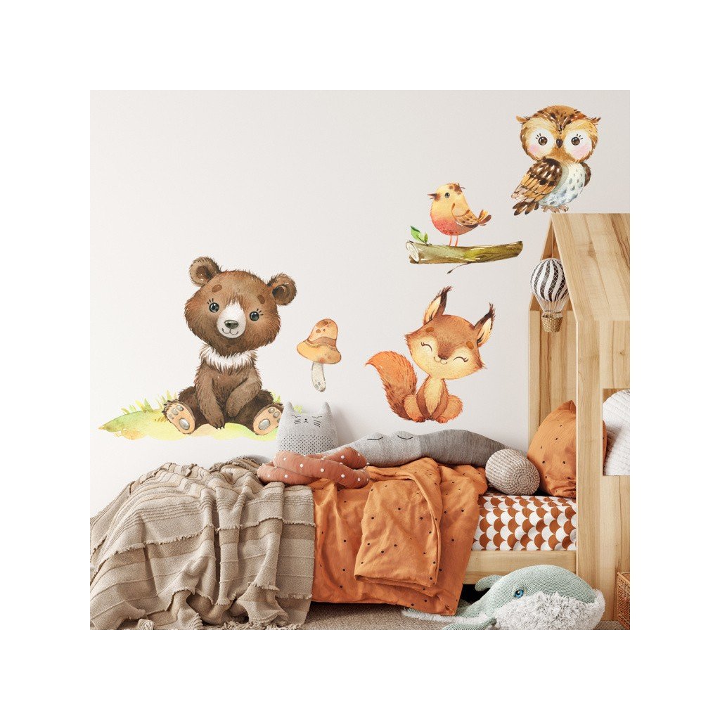 Samolepka na zeď - Medvěd, veverka, ptáček a sova XL